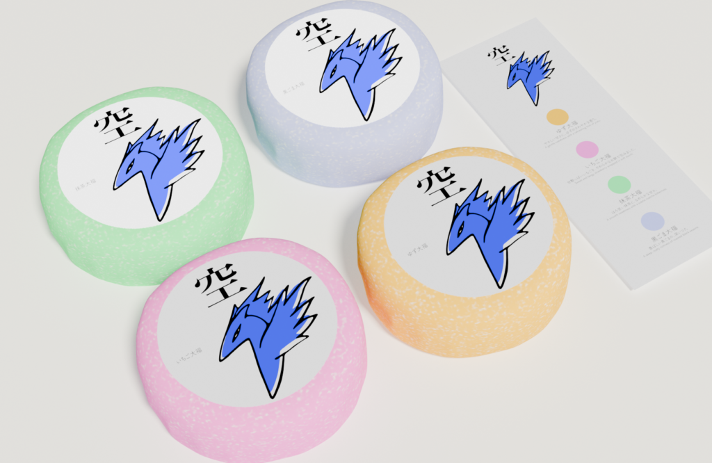 At the center of the design is Sora, a custom character created as the embodiment of a free spirit. Her sharp, expressive form brings energy and personality to the packaging, intentionally contrasting the softness and simplicity of daifuku. SORA challenges the quiet conventions of traditional wagashi packaging by introducing a playful, expressive identity designed to capture attention, convey personality, and bring a sense of joy and spontaneity to the everyday experience of Japanese sweets.